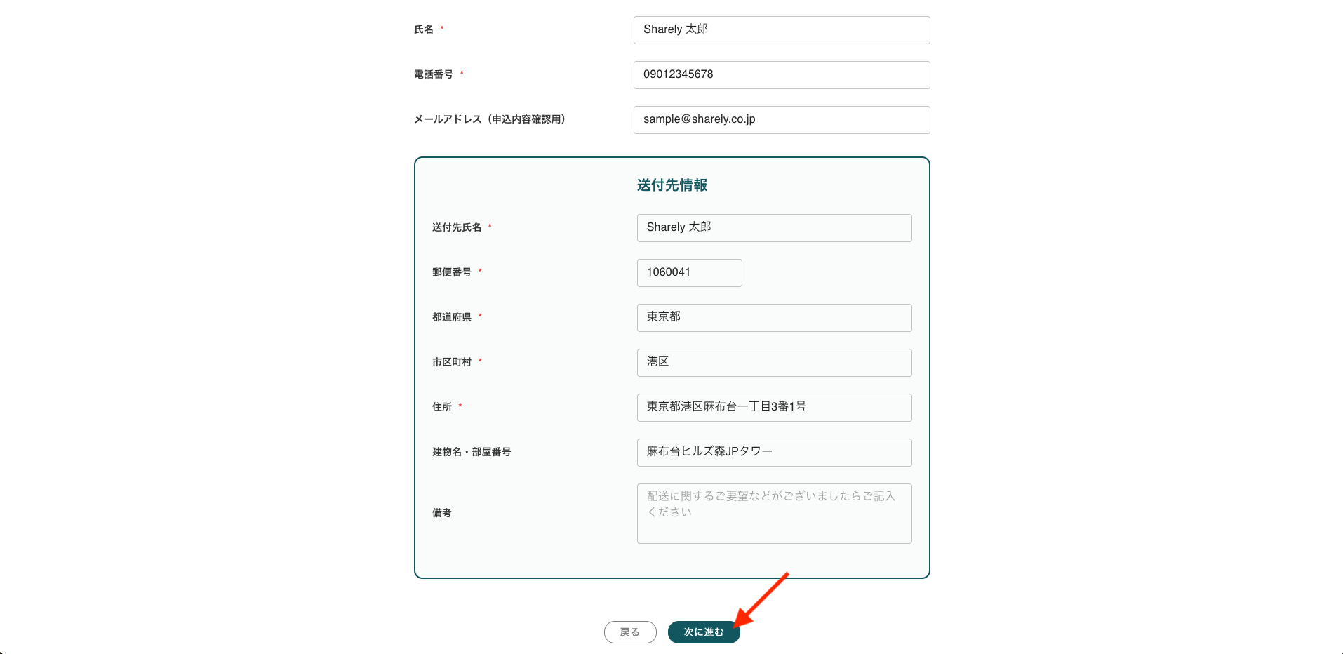 - 申込を行う株主様ご自身の情報と、送付先の情報を入力してください。