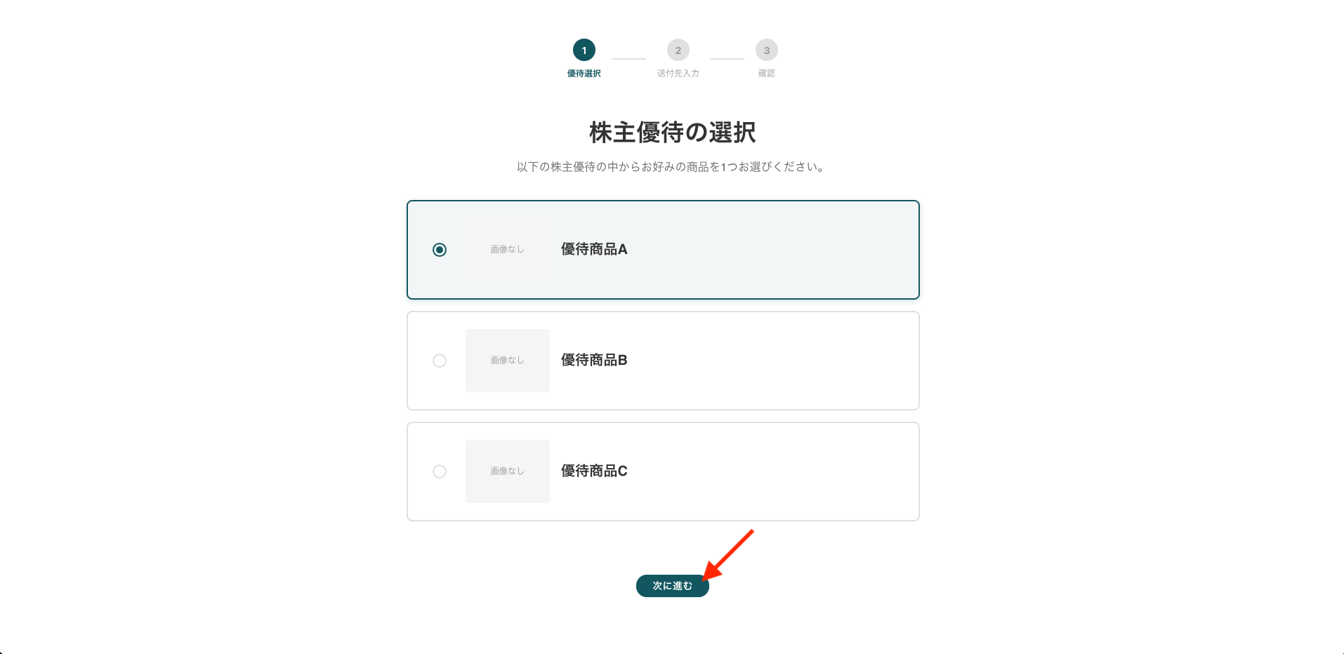 - 画面上に表示される株主優待商品の中からお好みの商品を1つお選びください。選択したら「次に進む」ボタンをクリックします。